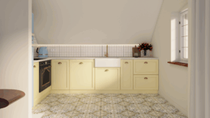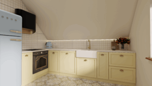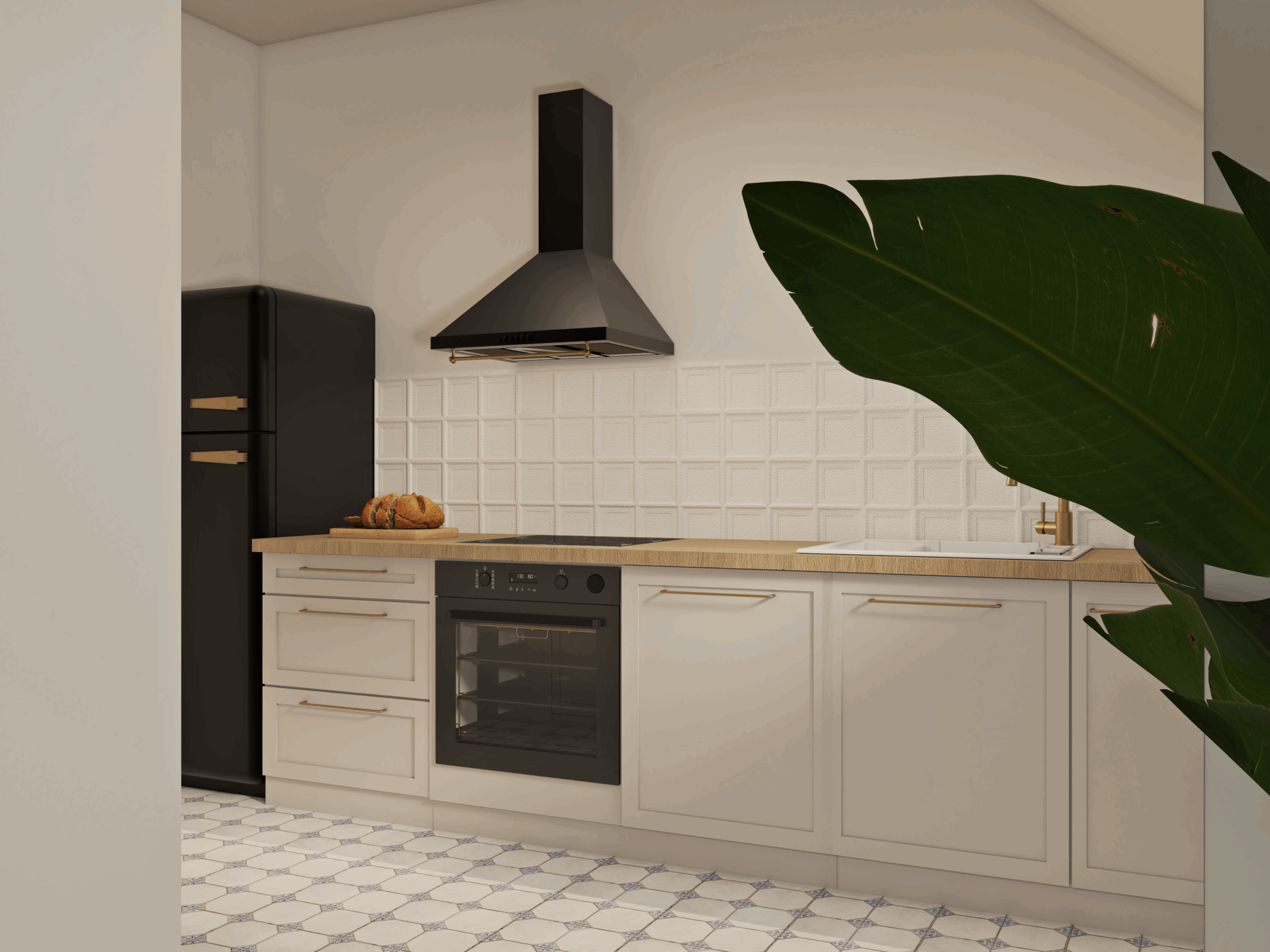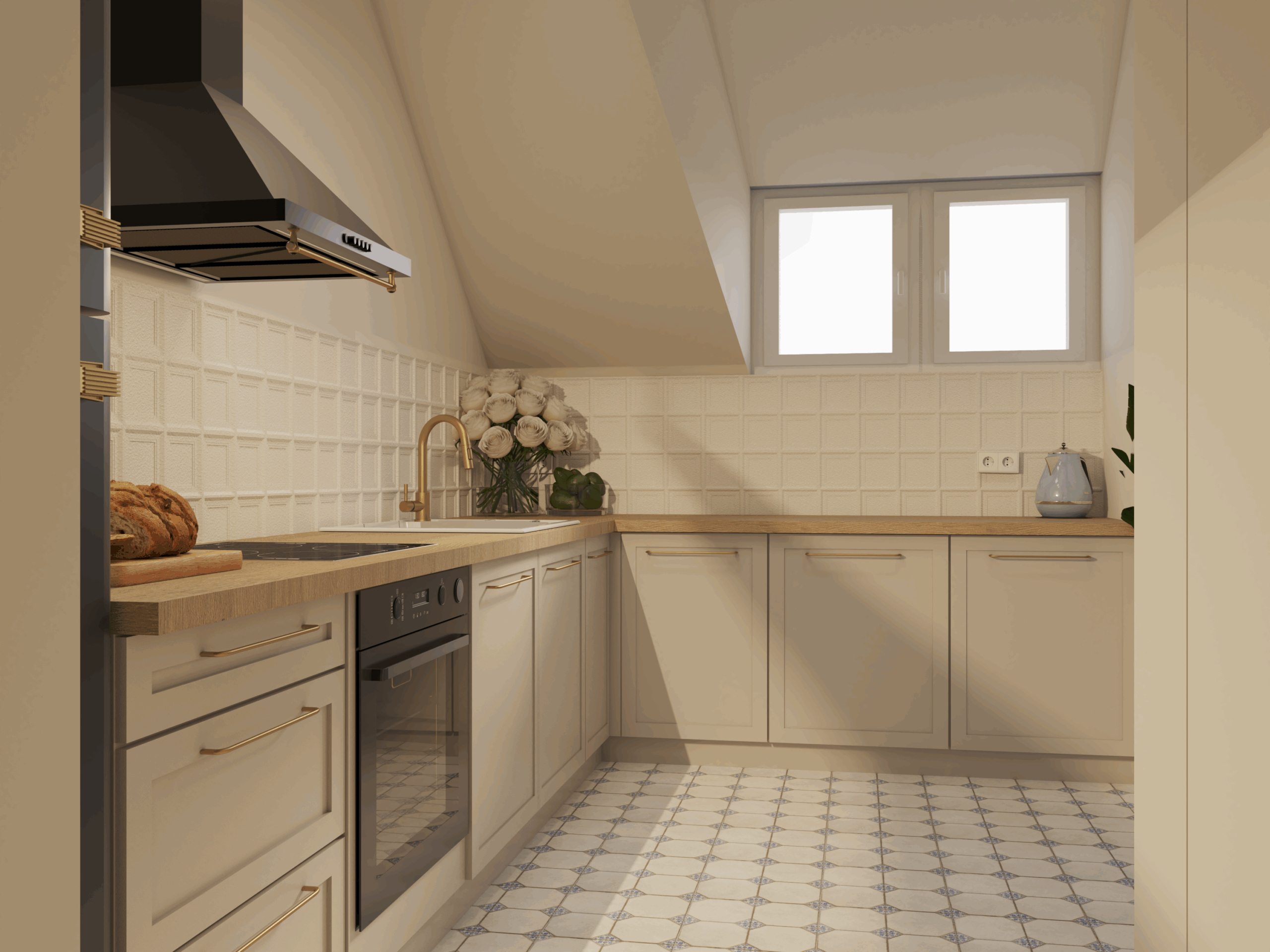 W kuchni uwagę przyciągają klasyczne fronty w ciepłym odcieniu, wzorzysta podłoga oraz proste, ceramiczne płytki ścienne, które nadają wnętrzu charakteru i delikatnej nuty vintage. Złota armatura i czarne akcenty wprowadzają elegancki kontrast, nie zaburzając harmonii całości.