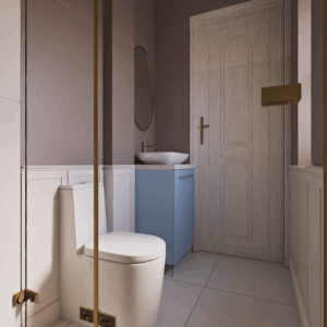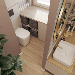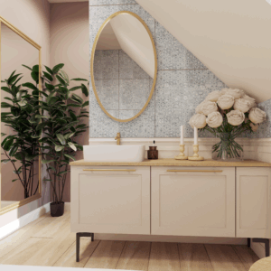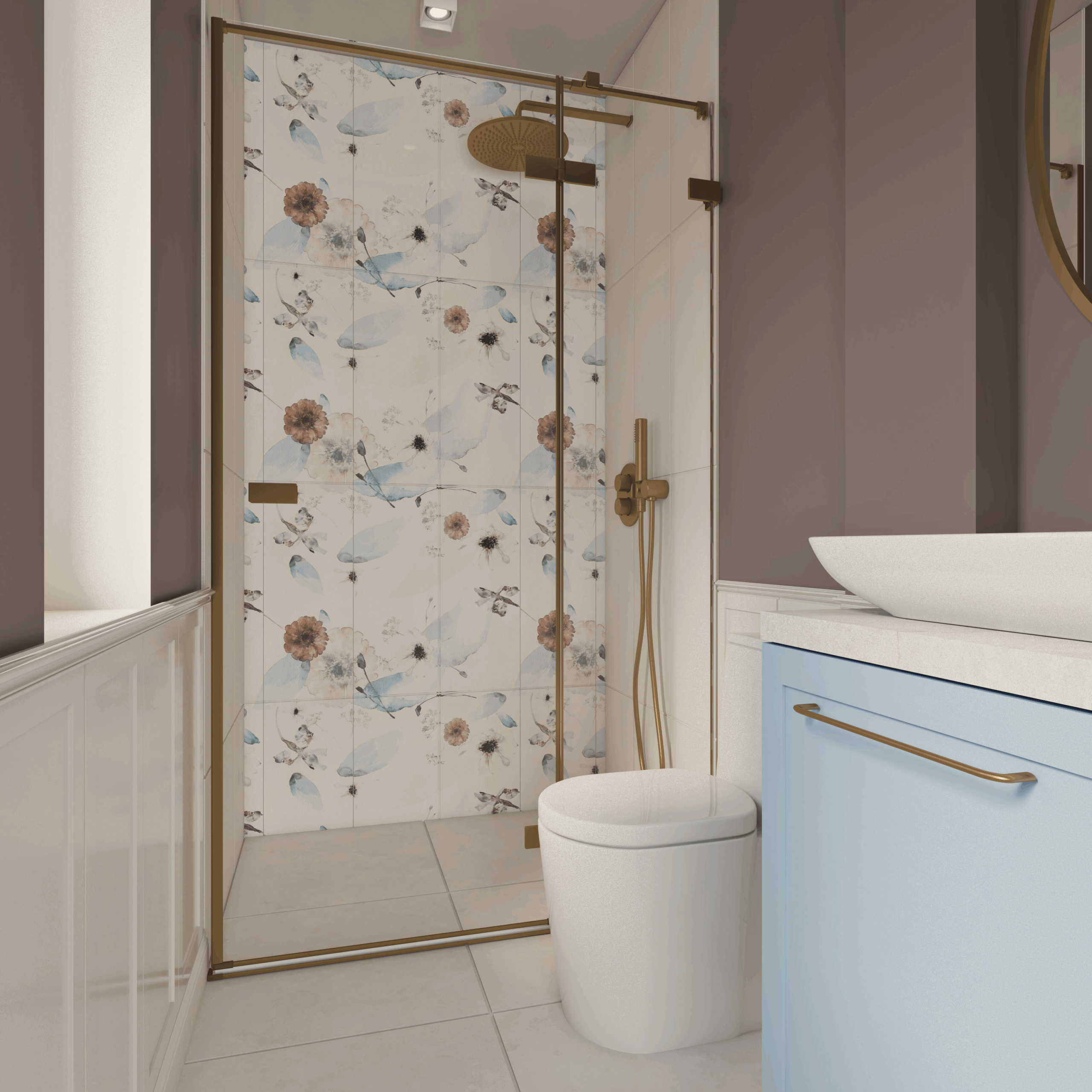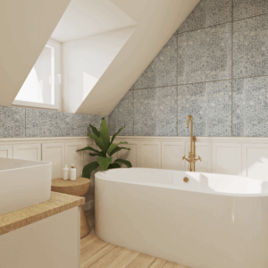 Łazienka utrzymana jest w spokojnej, naturalnej kolorystyce. Jasne drewno, dekoracyjne płytki w niebieskich tonach oraz wolnostojąca wanna tworzą domową strefę relaksu inspirowaną klimatem SPA. Miękkie światło, rośliny i zaokrąglone formy podkreślają przytulny charakter wnętrza.